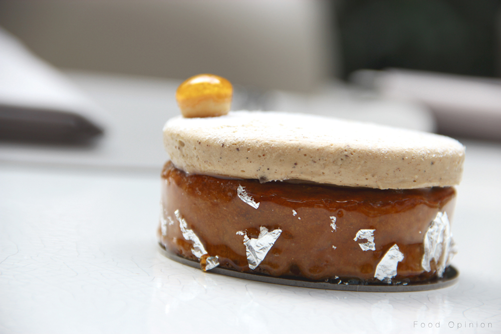 Le chef commence par nous présenter sa version du St-Honoré. C'est un dessert automatiquement emblématique de l'enseigne puisque l'hôtel se situe ... rue Saint Honoré ! J'avais adoré le culot de la présentation quand j'avais vu la photo. Je trouve ça tellement audacieux de changer complètement les codes visuels d'un dessert qu'on voit rarement dans une autre forme que celle originelle MAIS de placer un mini chou caramélisé sur le dessus pour attiser la curiosité. Comme prévu on retrouve tous les éléments au niveau du goût et la texture ne déçoit pas. Le chou est recouvert de caramel au beurre salé, fin et croquant. En son coeur, on différencie bien la crème pâtissière (allégée mais pas en goût) de la chantilly qui coiffe délicieusement le tout avec sa vanille douce mais sous les projecteurs. Le dessert surprend par sa simplicité, il remplit sa mission sans jamais être écoeurant.